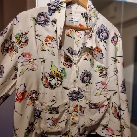 Nørgaard bluse, den lange version. Flot rød meleret farve. Den er brugt én gang.