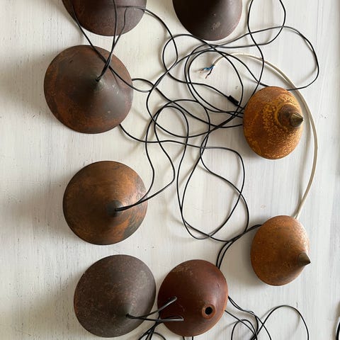 Tidsløst design. Pæn stand. To flotte hvide lamper med krom. Touch - tryk til at dæmpe lyset. Diameter 10 cm. og 8 cm. højde. Hele sættet et lige til at dætte op. Giver god belysning.