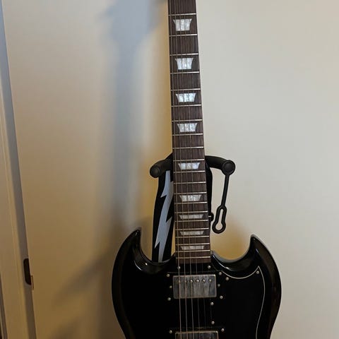 Epiphone SG PRO elektrisk guitar i sort farve. Guitaren har et dobbelt-cutaway design, to humbucker pickups, og en mahogni krop med en rosewood gribebræt. Velegnet til forskellige musikgenrer og spillestil. Skriv gerne hvis du vil snakke pris