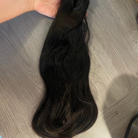 Sælger dette extensions. Det er ubehandlet og håndsyet. Nypris 4800. 50 cm og 150 gram. Det er naturligt bølget. I rigtig fin stand, ser stadig meget pænt ud. Farven er mørkebrun/brun. Skal bruges til flettemetoden, men der kan også påsættes klips så det kan bruges til klips extensions.