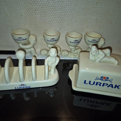 Lurpak keramik blev fremstillet for at promovere lurpak smør I England. Dette er aldrig solgt i Danmark. Den lille figur der går igen på tingene hedder Douglas. Desværre er der en skade på det ene æggebæger se billedet. Er fra røg og dyrefrit hjem . Prisen er fast