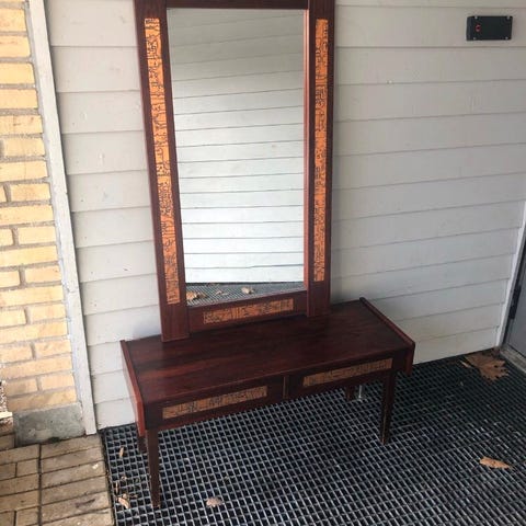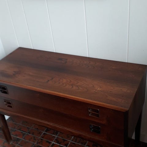 Entresæt med skuffemøbel og spejl i palisander med blå kakler. Erik Wørtz. Entremøblet måler h: 45,5 cm. L: 53,5 cm. D: 33,5 cm.