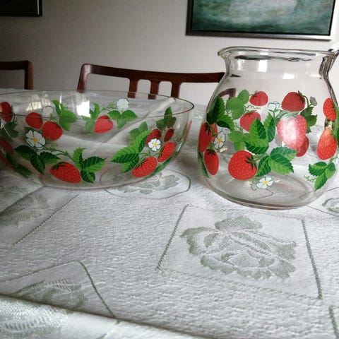 Såkaldt jordbærkande i rosafarvet opalineglas. Med muslingehank og i fin stand uden revner eller skår. H 19-20 cm.