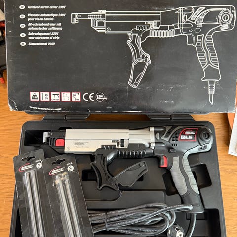Würth Master System Typ 513 Ergo elektrisk gips-skruemaskine med forskellige bits og tilbehør. Sættet indeholder foruden maskinen et udvalg af bits i forskellige størrelser og former, samt ekstra tilbehør til forskellige skruetyper.