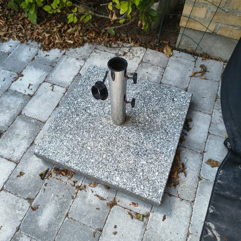 Rektangulær parasolfod i lys grå granit med rustfri stål. Mål 27x45 x8 cm. Som ny