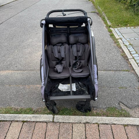 Vi har været enormt glade for den. Der er to pladser med sele. Der medfølger et hjul, som kan udskiftes på fronten, så den fungerer som klapvogn. Der medfølger desuden 2 "dimser" som den fastsættes med på cyklen - så den let kan monteres på to forskellige cykler.