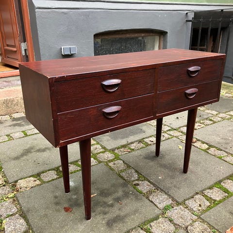 Fire skuffer med de karakteristiske Kai Kristiansen-greb og høje, slanke ben i massivt træ.
