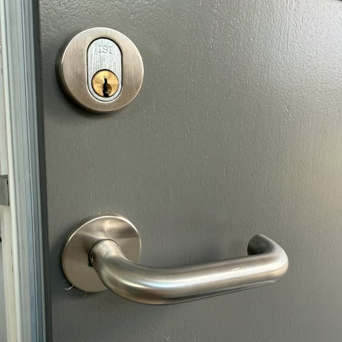 Dørhåndtag i metal. Der er kun den ene side. Som det ses på billede er der et lille hak. Design Arne Jacobsen. Jeg sender ikke