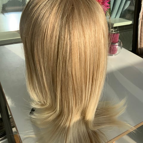 Blond paryk med langt, bølget hår. Parykken har indvendige klemmer og justerbar strop for sikker pasform.