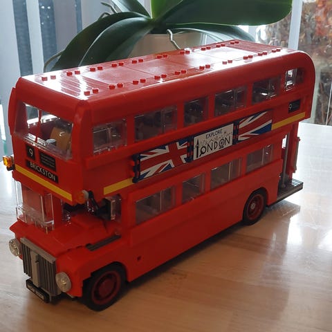 LEGO Creator London Bus Model er en rød double decker bus lavet af plastik. Sættet er designet til voksne og unge over 16 år og indeholder detaljerede funktioner, der repræsenterer en klassisk London bus. Modellen inkluderer flere vinduer, døre og skilte, der efterligner det originale køretøj.