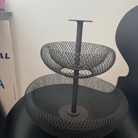 2 stk stål opsats med fod i teaktræ, En firkantet (21,5 cm x 21,5cm) og en rund (diameter 21,5 cm). Teaktræsfoden er firkantet på det firkantede fad og rund på det runde fad.