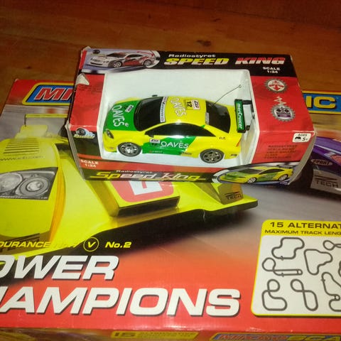 Super fed bane med ekstra skinner og 1 ekstra bil (3 i alt). Den er ikke brugt meget og derfor næsten som ny, og i original emballage (undtagen ekstra skinner).