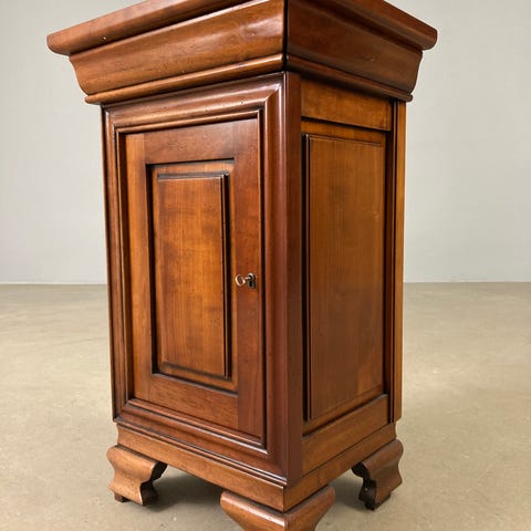 Elegant, gammelt og håndlavet snedkerskab i massivt fyrretræ, designet til at hænge på væggen. Skabet har et tidløst og naturligt udtryk med fine snedkerdetaljer, som fremhæver træets varme glød og unikke struktur.