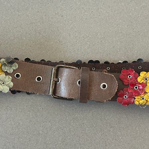 Sort blomsterbælte til kvinder fremstillet i læder med blomsterdetaljer langs hele bæltet. Bæltet har justerbare huller til tilpasning af størrelsen og en spænde i metal. Velegnet til at fremhæve taljen og som tilbehør til forskellige outfits.