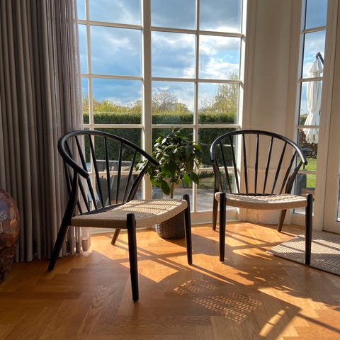 2 stk skalstole i egetræ med sort stålstel.