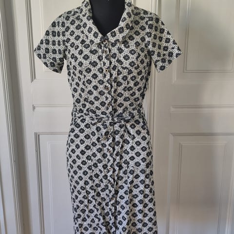 Vintage kjole i størrelse M. Mærke: Daisy Dapper Retro skjortekjole med brændt orange farve - elegant og feminin. Lukkes m lynlås i ryggen og to lommer. Købt i Mondo Kaos for ca 6 år siden for 1.100 kr. Tjek evt deres hjemmeside - kjolen minder om model Betty men er uden bælte.