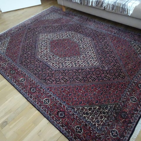 Smukt mønstret ægte tæppe i røde og blå nuancer.