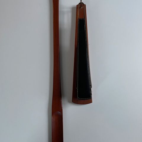 Skobørste med holder til at hænge på væggen. I mørkebrunt træ (teak?). 30 cm lang. Formentlig fra slutningen af 1960'erne. I fin stand. Få, meget små brugsspor.
