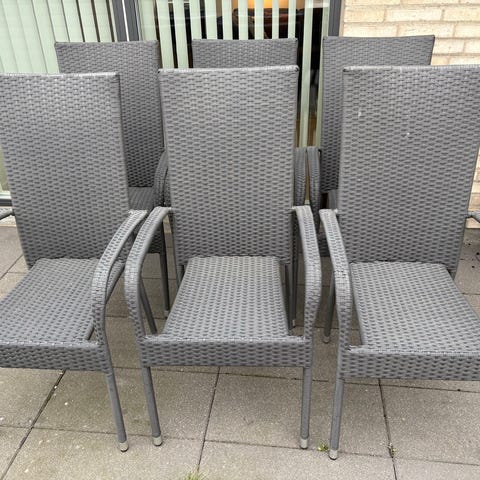6 stk. havestole i gråt/sort flet. Sædehøjde: 45 cm, sædedybde: 45 cm. højde på ryglæn: 93 cm. Alle 6 stole er helt intakte og fejlfri. Kan efter aftale afhentes i Liseleje eller Gentofte. (2 af de 8 på fotoet er solgt.)