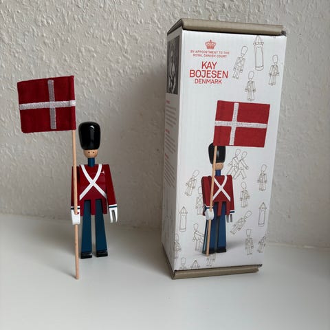 Kay Bojesen lille fanebærer med stofflag. Figuren er lavet i træ og malet i rød, blå og hvid og bærer traditionel garderuniform samt dannebrog. Arme og ben er bevægelige. Små afskalninger ved “hænder”, hvor den har holdt flag. Brugt få gange og har ikke stået fremme, men været opbevaret i æske. I original emballage og stofpose.