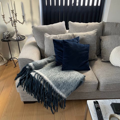 Sættet er brugt, men stadig rigtig pænt. Der er et par små trådudtrækshuller (se billeder) og en lille plet på den hvide side af den ene pude (kan sandsynligvis gå af i vask, jeg har ikke nået at forsøge.