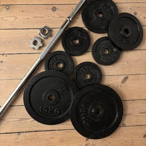 York Justerbar Vægtstang med Vægtskiver, samlet vægt cirka 14 kg. Vægtstangen er sort og lavet af metal med plastikbelagte vægtskiver. Vægtskiverne kan justeres efter behov og fastgøres med skruelåse. Velegnet til styrketræning i hjemmet.