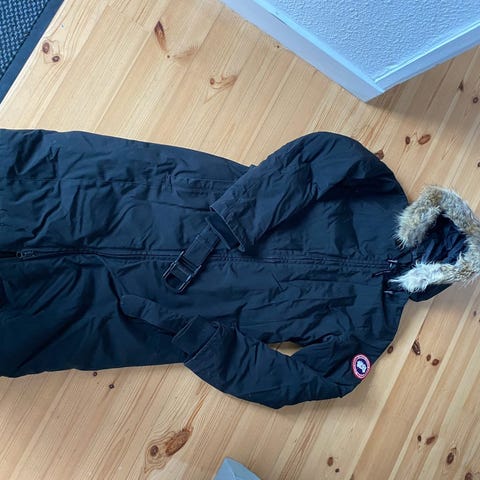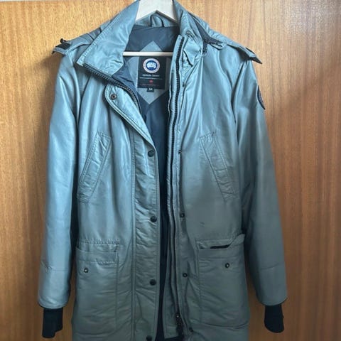 Canada Goose Vinterjakke i størrelse M til kvinder. Jakken er beige og designet til vinterbrug med isolerende materiale og en hætte med pelskant. Den har flere lommer og en justerbar talje for bedre pasform.