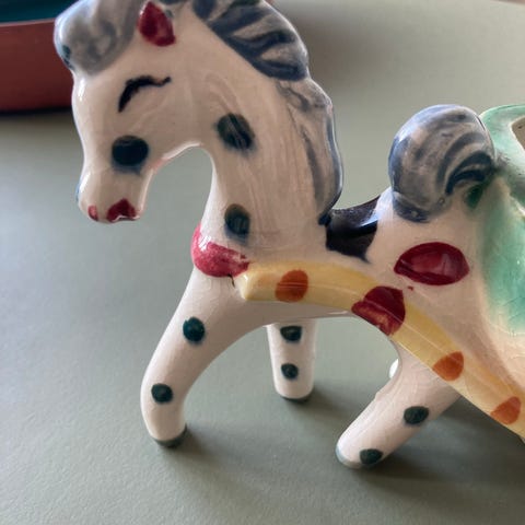 Charmerende retro keramikfigur forestillende en hest med vogn i flotte håndmalede farver. Figuren er dekoreret med prikker og detaljer i gul, grøn, blå og rød. Vognen er hul og kan f.eks. bruges som lille urtepotte, opbevaring eller bare som dekoration. Et skønt stykke vintage keramik, som tilføjer farve og nostalgi til ethvert hjem.