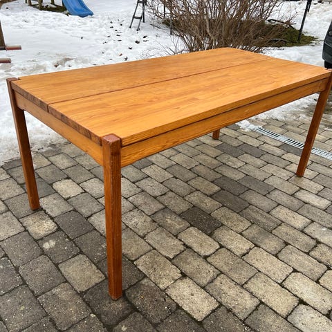 Smukt og karakterfuldt spisebord i massivt fyrretræ med en naturlig, rå finish. Bordet er ubehandlet og kan derfor enten bevares i sit nordiske, ærlige udtryk eller behandles efter eget ønske.