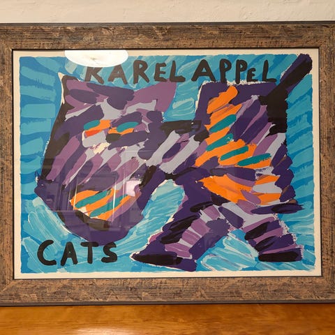 Karel Appel plakat med abstrakt fugle motiv. Er indrammet og viser karakteristiske farverige og ekspressive former, typisk for kunstnerens stil.