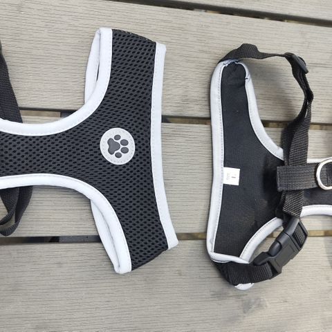 Selerne er kun prøvet på - mine hunde fælder, så der sidder lidt hår på, men ellers er de fuldstændig nye. De var desværre for små til mine hunde.