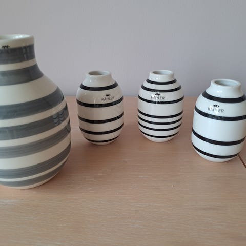 Fine Kähler vaser. 1 stk hvid m. grå striber 14 cm høj kr. 75,-, 3 stk hvide m. sorte striber 9 cm høje kr. 110,- for alle 3. Pris for alle 4 stk kr. 150,- Kvalitets keramik. Alle nye og ubrugte. Prisen er fast. KAN OGSÅ SENDES.