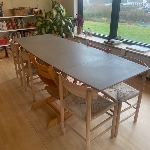 5 år gammelt spisebord fra Ilva. Brugt med få brugsspor, stadig meget flot. Udslået 242 cm, via udtræk i hver ende (hollandsk udtræk). Hvidpigmenteret metallernes egefiner og ben i massiv hvidpigmenteret matlakeret eg. Nypris 12.499.