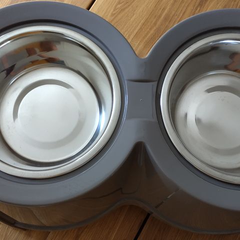 Companion Hundeskål med træholder og to keramiske skåle. Holderen er lavet af teak træ formet som en hund, designet til at holde skålene stabilt. Skålene er hvide og velegnede til mad og vand til kæledyr. Skålene måler 13 cm i diameter , skålene har en højde på 12 cm så den er perfekt til en lille hund