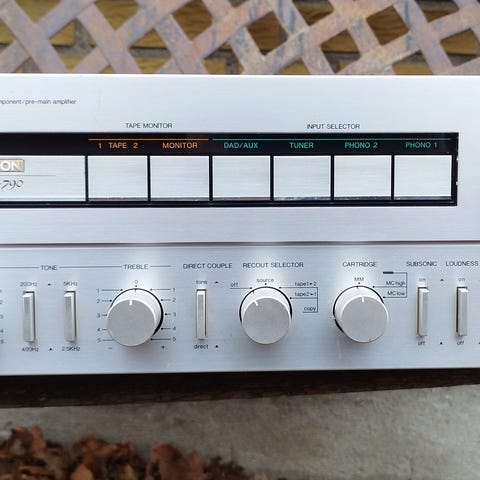 Denon AV Receiver i sort farve med flere kontrolknapper og drejeknapper til lydstyrke og indstillinger.
