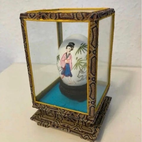 Glasmontre med malet Buddha æg, Gl Buddha på æg i glasmontre med metalkanter