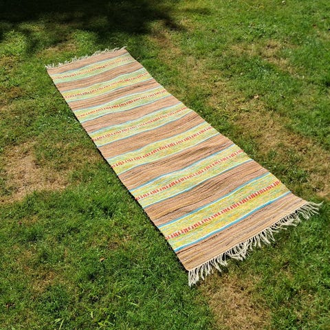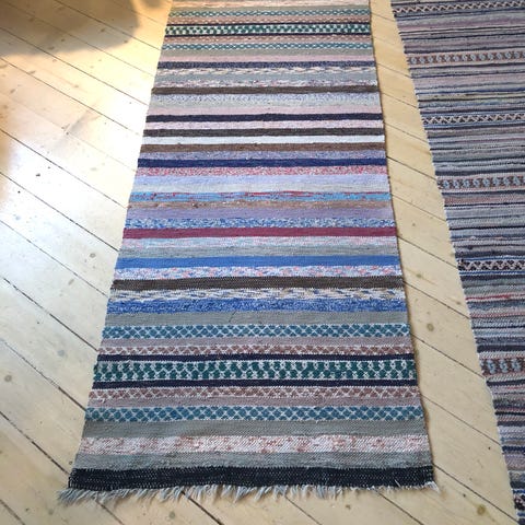 150 cm x 72 cm.Fint tæppe i lyse farver. Længden er med grundene i begge ender. Købt i Sverige for et par år siden. Ikke plast. Fint at lægge ved sengen i soveværelset. Kunne også være fint i sommerhus, kolonihavehus eller måske kollegieværelse. Kan sendes for 60kr.