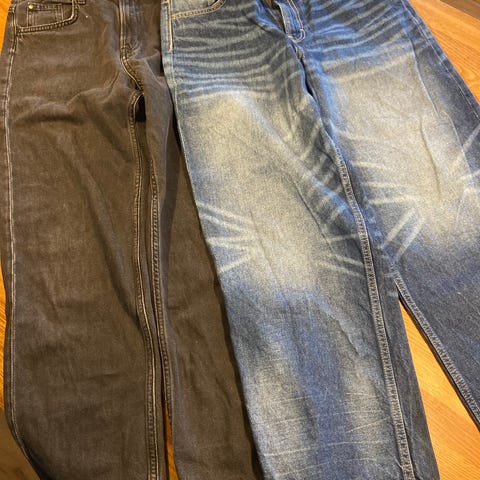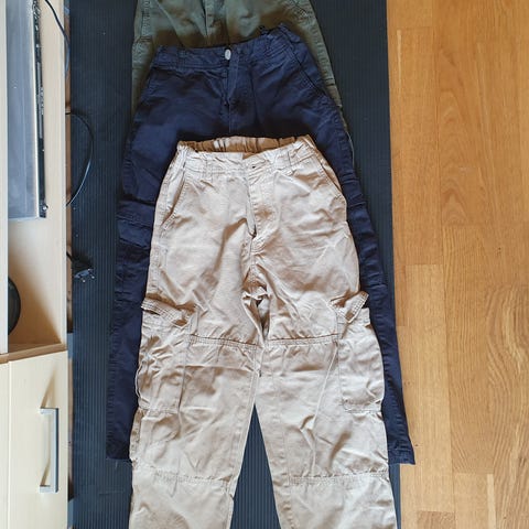 Bukser Faldskærmsbukser mørkeblå. Benlommer med klap. Løs pasform med elastik i taljen og snydegylp med trykknap. Forlommer med klap og skjult trykknap. Læg der giver ekstra vidde, lige ben med snøre nederst. 100% bomuld. De har mistet farve i kanter og folder, ingen pletter, huller el.l. men har ligget så de er blevet ekstra krøllet. Ann. nr. D193