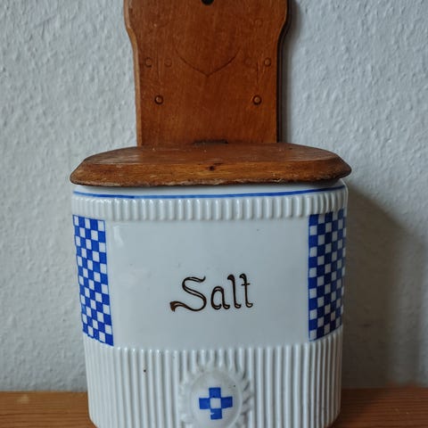 Skønneste saltkar til at hænge på væggen. Og som noget helt særligt - og vældig praktisk - kan glasbeholderen tages af, når den fx skal vaskes eller man skal bruge saltet et andet sted. Den er i massivt træ og måske kunne malingen tages af. I bunden af glaskarret står Poncet, så den er måske fransk 😊 20 x 17 x 14,5 cm. Ingen skår. Se fotos.