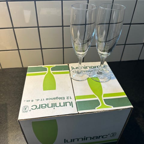 8 flotte champagneglas fra Franske Luminac. Med flot blå stilk. 22 cm. høje. Passer super til musselmalet stel.