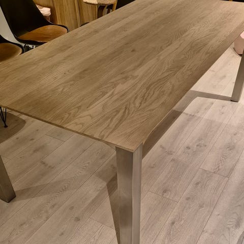 Meget velholdt spisebord i massiv eg og stålben, fremstår næsten som nyt. Bordhøjde, 75,5 cm - siddehøjde 70 cm. Vægt 84 kg.