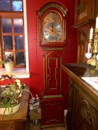 Smukt rødt standerur med guldskive og fugl der kan kan bevæge sig når uret stilles