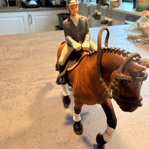 Schleich Eventyrfe med hest figur sæt består af en fe-figur med vinger og en hest med detaljerede man og hale, dekoreret med blomster. Figuren og hesten er fremstillet i holdbart materiale og designet til børn til leg og samling.