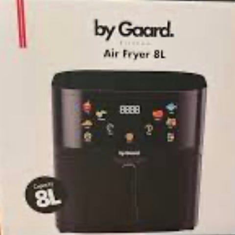 EPIC Air Fryer med tilbehør i hvid og sort farve. Indeholder en air fryer enhed med temperaturstyring og forskellige tilbehør såsom spyd, rist og bageplade. Designet til nem tilberedning af mad med mindre olie. Aldrig været brugt