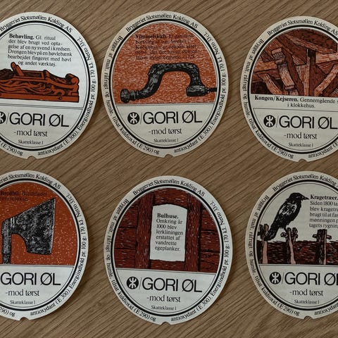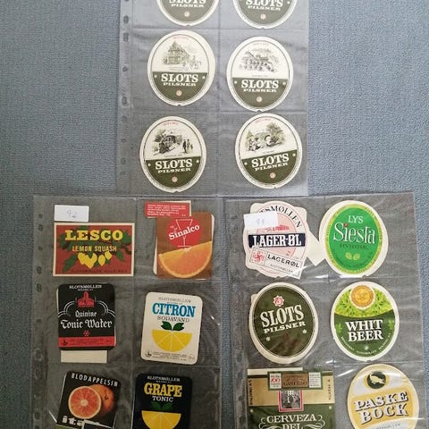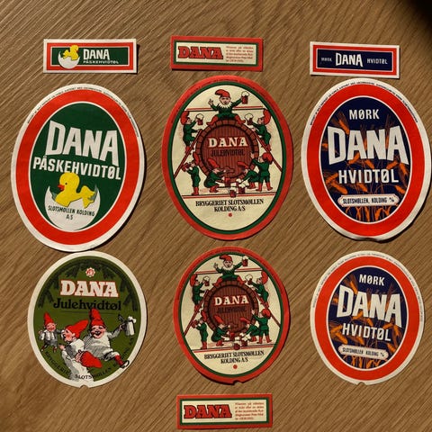 Flot og varieret sæt fra Slotsmøllen Kolding, inkl. Dana Påskehvidtøl, Bord-Øl, Prima Hvidtøl, Malt-Øl og Slots Pilsner samt 3 halsetiketter.