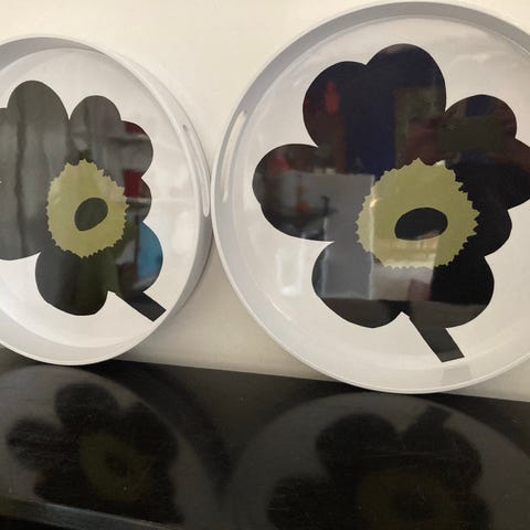 Marimekko Unikko bakke med grønne blomsterprint. Bakken er lavet af holdbart materiale og har et ikonisk design med store blomster i forskellige grønne nuancer. Velegnet til servering eller som dekorativt element i køkkenet. Måler 40x50 cm