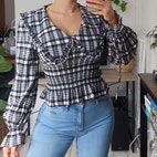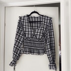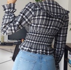 Den er i sort og hvid tern og med binde snore ved ærmet