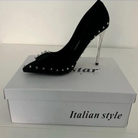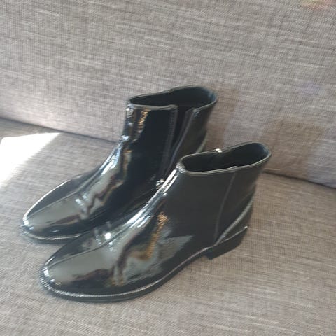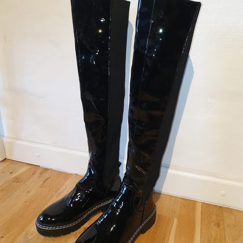Sorte højhælede støvler med guld detaljer ved snørebånene og lynlås på indersiden.