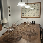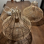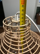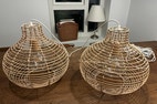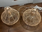To fine lampeskærme i flettet træ/rattan med fatning i træ og store elpærer. Lamperne måler ca 34 cm i højden og 40 cm i diameter. En ekstra elpære følger med i købet. Ledningen kan nemt skiftes ud, hvis man ønsker et andet udtryk. Længden på ledningen/fatningen inde i lampen kan også nemt justeres, hvis man ønsker, at den hænger længere oppe (eller nede) inde i lampen. Kommer fra røgfrit hjem. Sælges samlet og kan desværre ikke sendes.