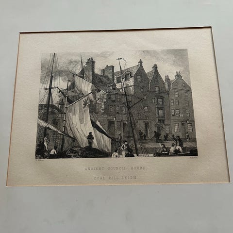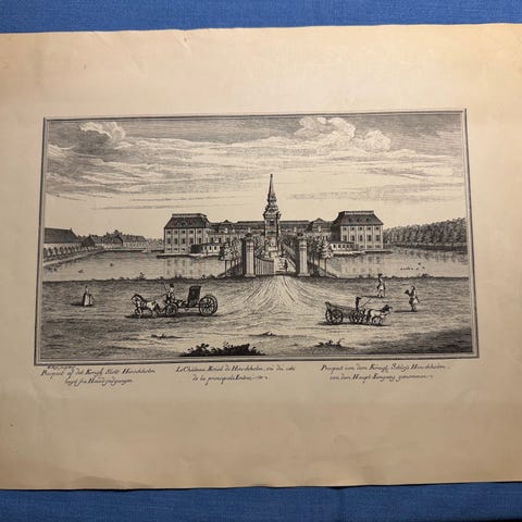 Billedet viser et kobberstik/tryk/tegning af Hirschholms Kirke.